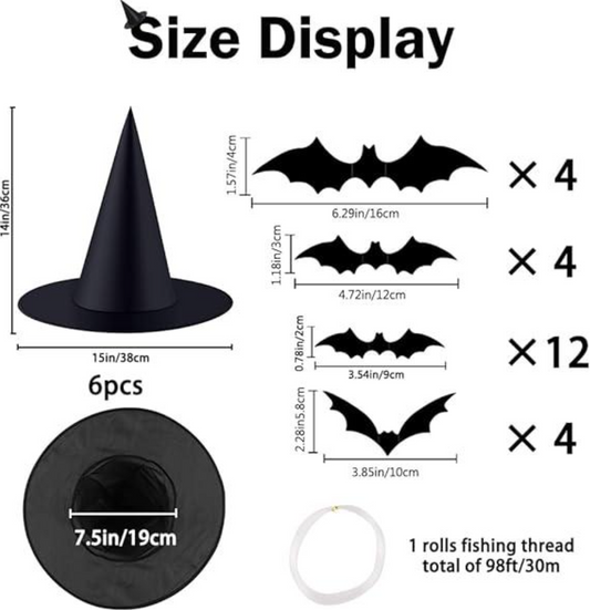 Halloween Witch Hat Set with 3D Bat Wall Decorations